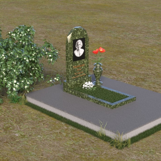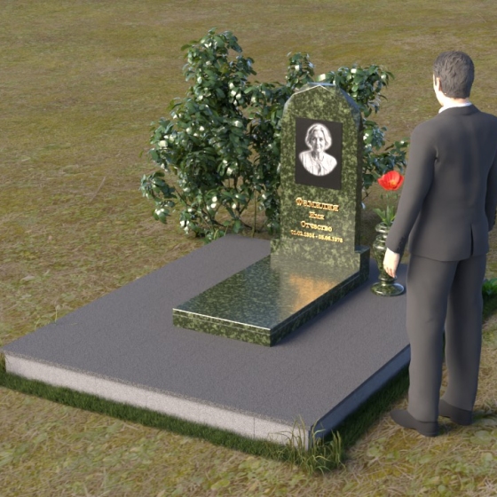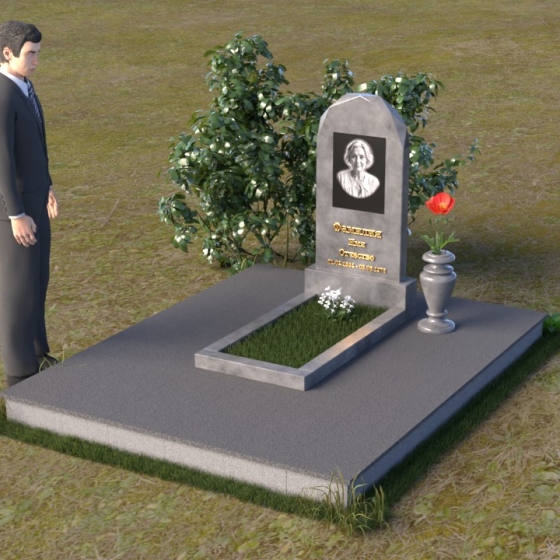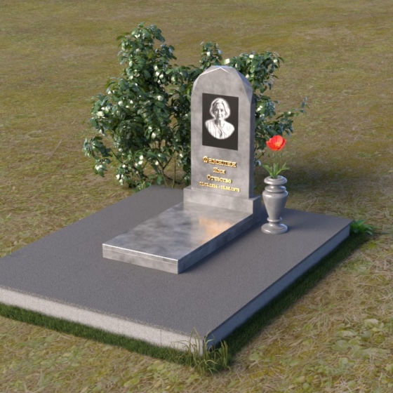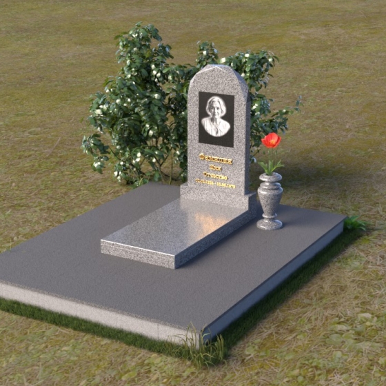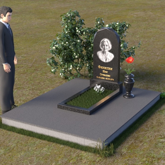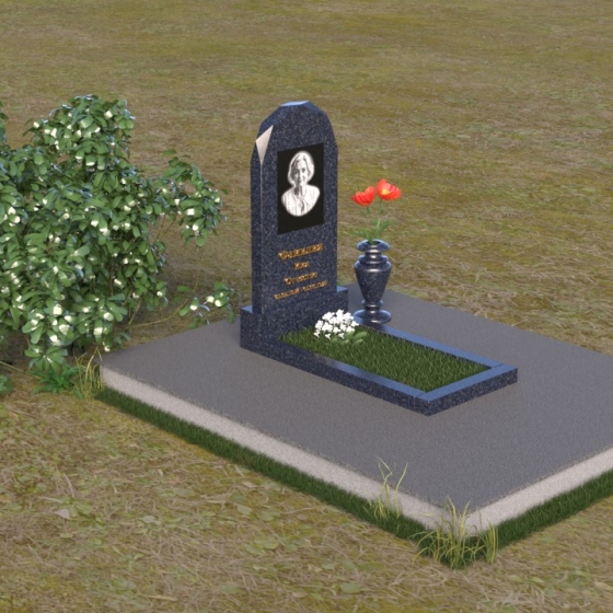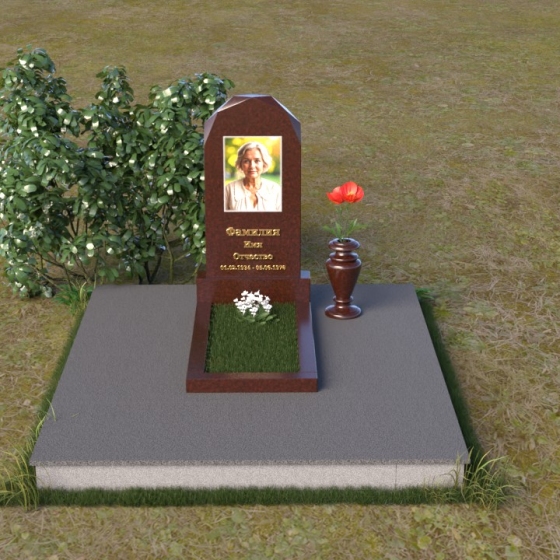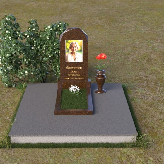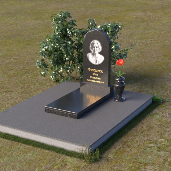 Форма стелы ПВ 069 предоставляет прекрасные возможности для размещения портрета и памятной надписи. Изображение можно расположить в верхней части стелы, где оно будет хорошо освещено и заметно. Золотое тиснение имени и дат жизни на темном фоне гранита создает элегантный контраст и добавляет торжественности. Вертикальное расположение текста гармонично сочетается с формой стелы и позволяет разместить достаточное количество информации, чтобы выразить всю глубину вашей любви и скорби. Рядом со стелой можно установить небольшую вазу для цветов, которая станет символом неувядающей памяти и заботы. Маленькая гранитная плита, расположенная перед стелой, может служить местом для возложения венков или памятных вещей.